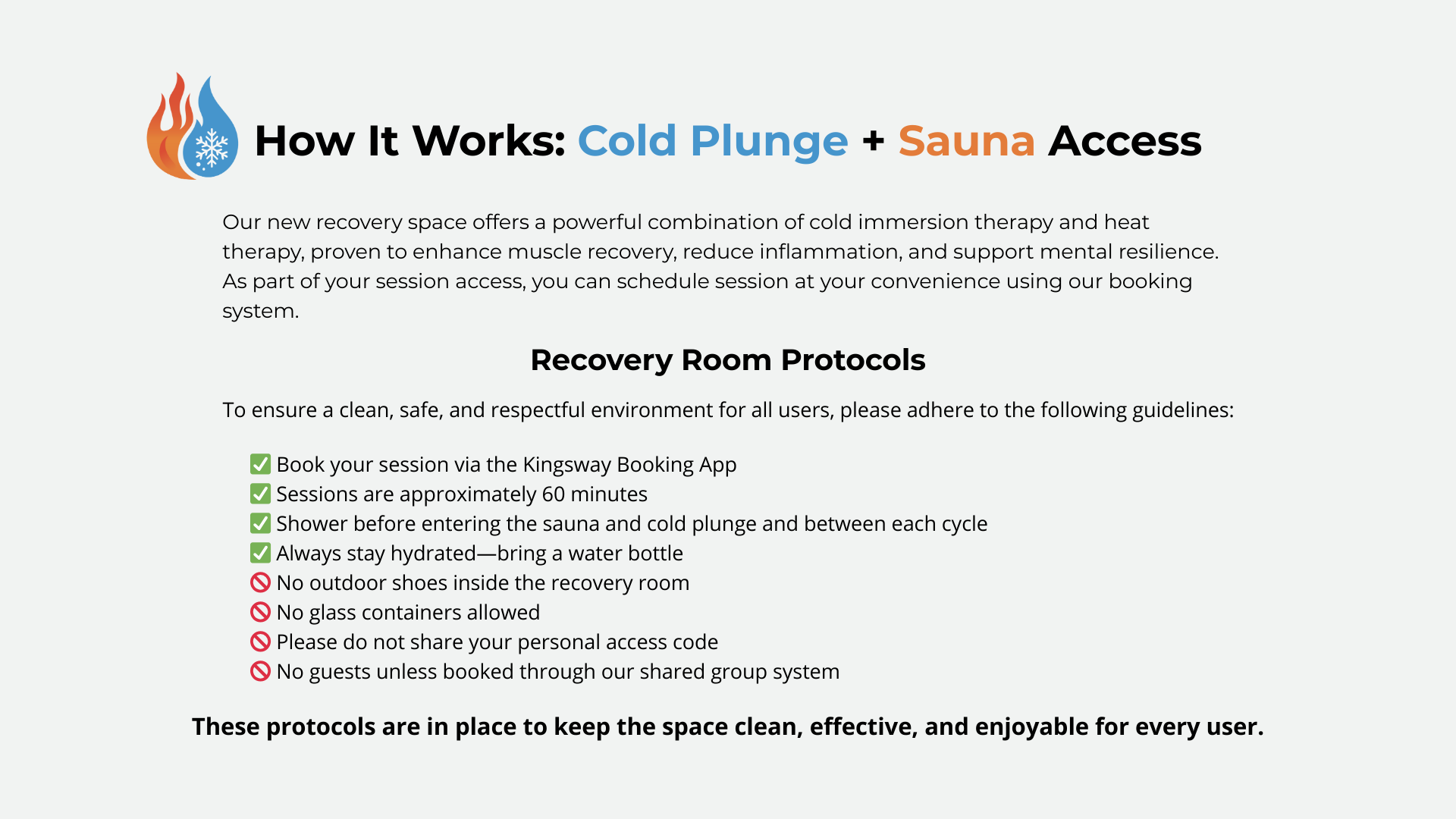 1. Use Appropriate Attire – Swimwear is required for cold plunge use.